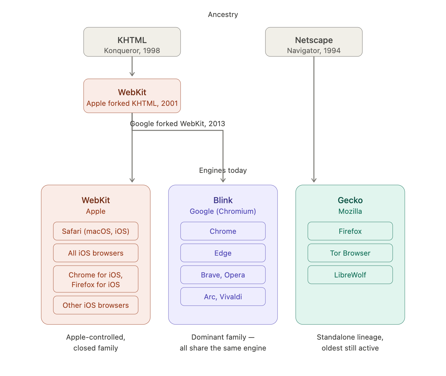 One thing worth noting: Blink was forked from WebKit in 2013. So Chrome and Safari share a common ancestor, but they've been diverging for over a decade. They're close relatives at the code level and still behave differently in enough ways to matter.